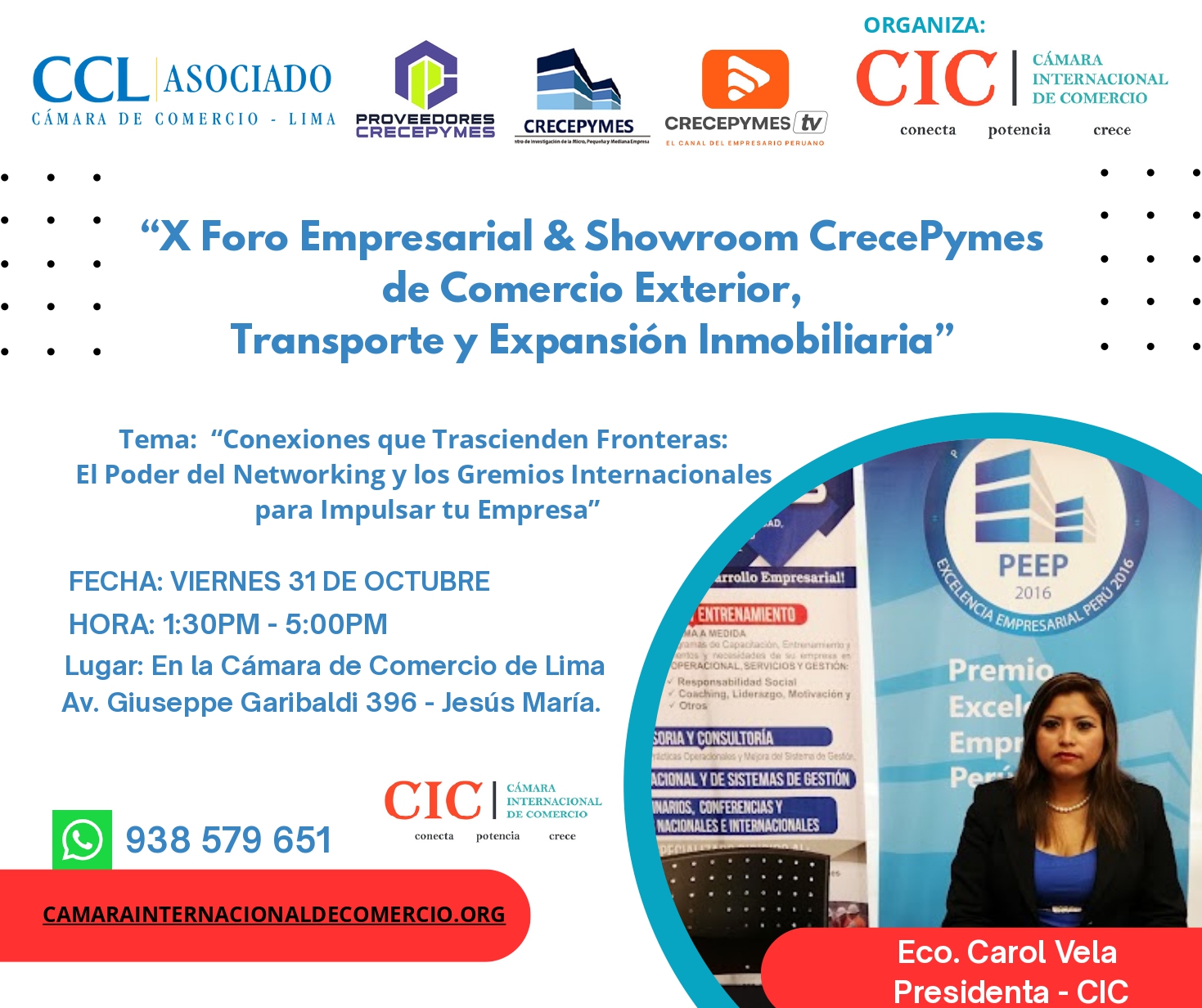 El centro de Investigacion CrecePymes y CrecePymesTV expresa su especial reconocimiento a la Econ. Carol Vela, Presidenta de la institución, por su brillante exposición “Conexiones que trascienden fronteras: el poder del networking y los gremios internacionales para impulsar tu empresa”, presentada durante el X Foro Empresarial & Showroom CrecePymes de Comercio Exterior, Transporte y Expansión Inmobiliaria.